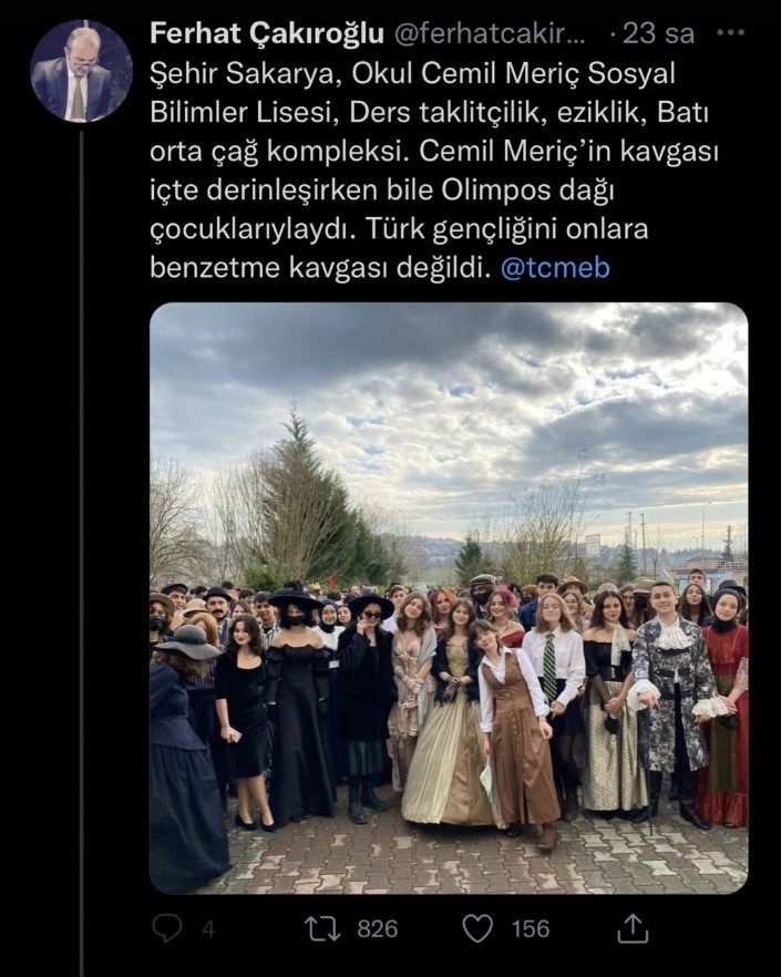 Haber 2: Cemil Meriç Sosyal Bilimler Lisesi’nde gerçekleşen Roman Kahramanları Festivali Milli Eğitim Bakanlığına şikâyet edilmişti. Müşteki vatandaş “Milli Eğitim’in amacı ortalama TC vatandaşı yetiştirmektir” diyordu.
